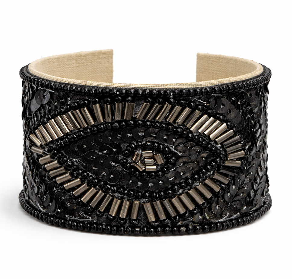 Hand-beaded in layered black sequins and deep onyx beads, the central eye is framed by gunmetal rays that shimmer subtly in the light. Structured yet comfortable, the cuff is lined in soft neutral fabric and designed to contour the wrist with effortless presence.